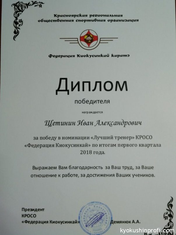КРОСО «Федерация Киокусинкай» поздравляет Сенсея Щетинина Ивана Александровича с победой в номинации «Лучший тренер».