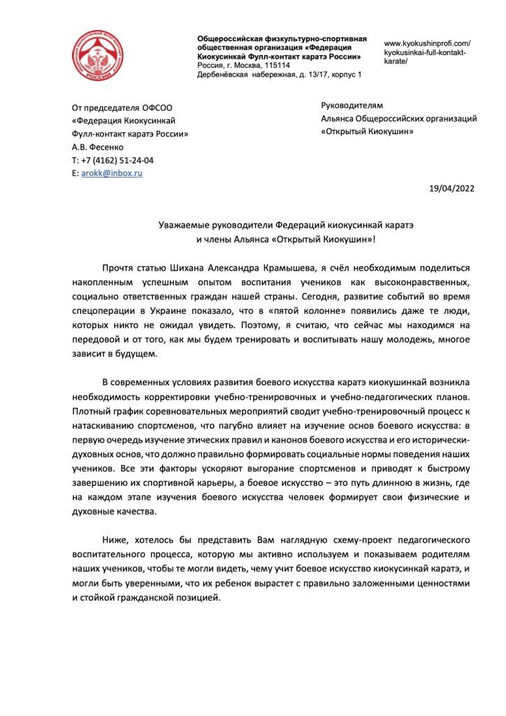 Уважаемые руководители Федераций киокусинкай каратэ и члены Альянса «Открытый Киокушин»!