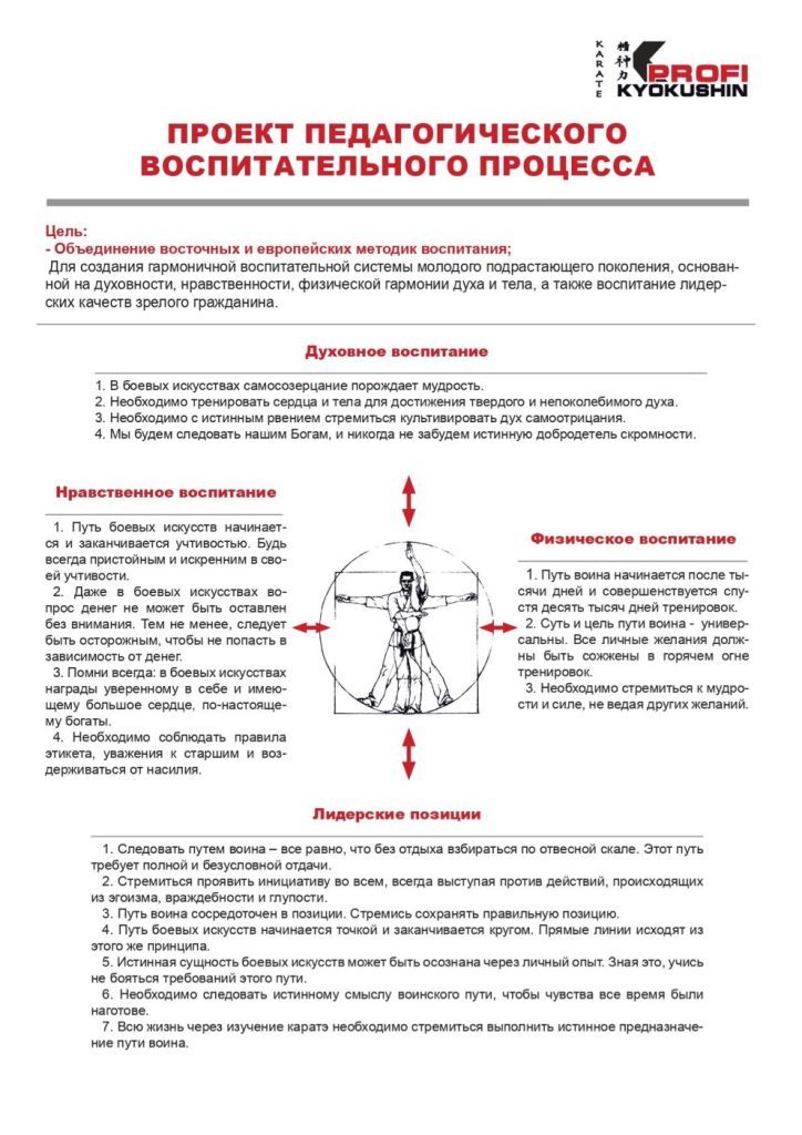 Ниже, хотелось бы представить Вам наглядную схему-проект педагогического воспитательного процесса, которую мы активно используем и показываем родителям наших учеников, чтобы те могли видеть, чему учит боевое искусство киокусинкай каратэ, и могли быть уверенными, что их ребенок вырастет с правильно заложенными ценностями и стойкой гражданской позицией.