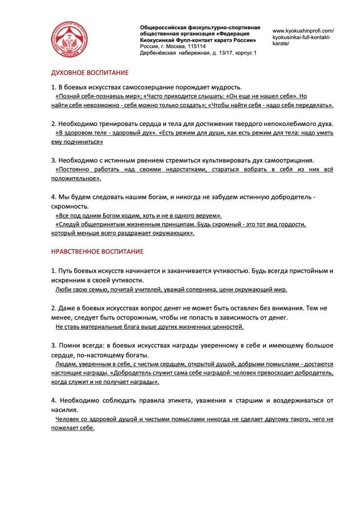 1. Путь боевых искусств начинается и заканчивается учтивостью. Будь всегда пристойным и искренним в своей учтивости.