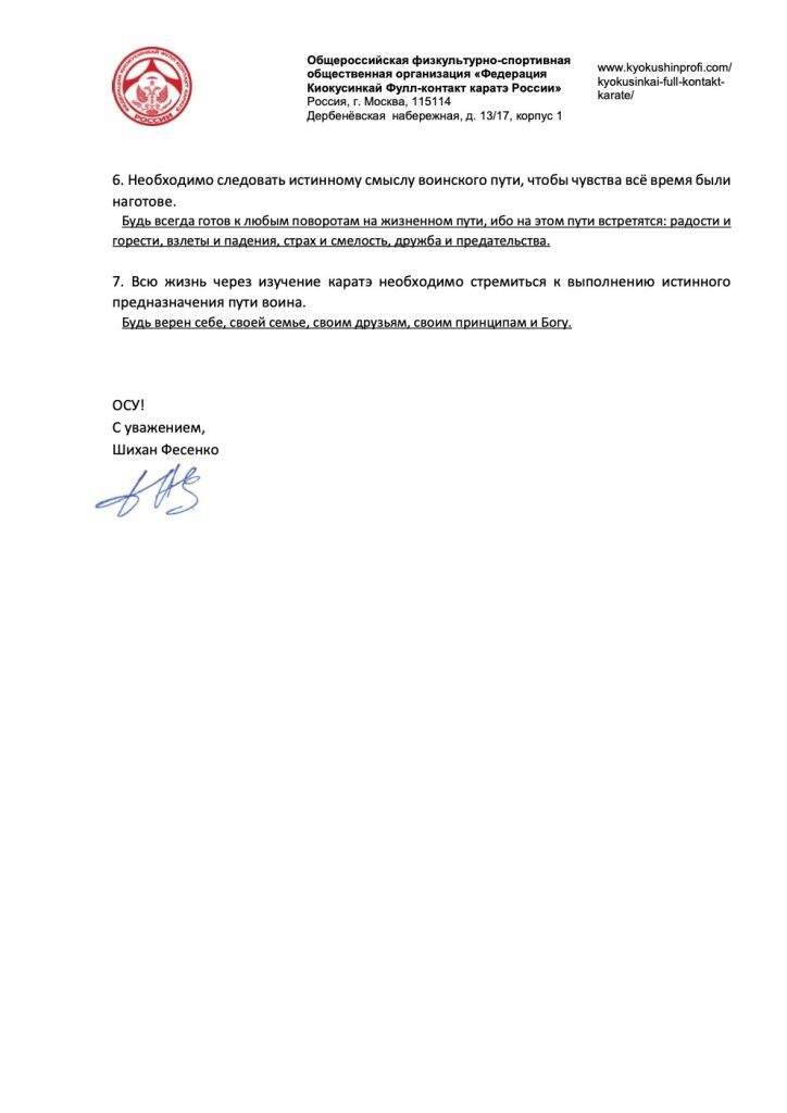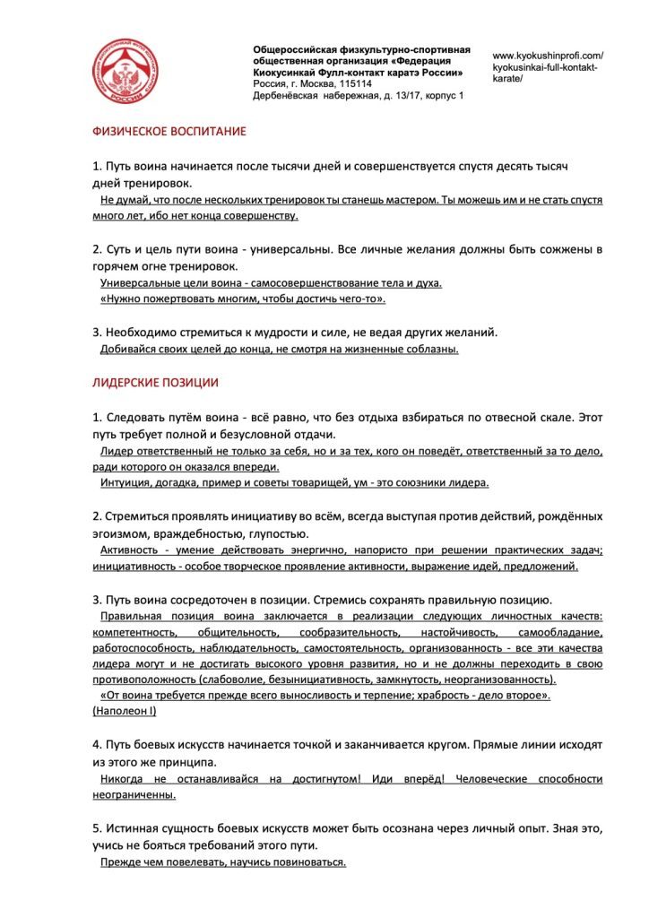 7. Всю жизнь через изучение каратэ необходимо стремиться к выполнению истинного предназначения пути воина.